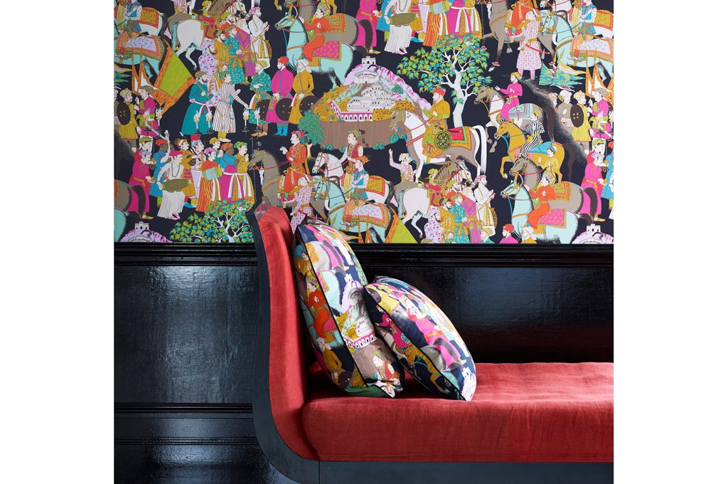 Un'esplosione di colori forti su fondo nero per la tappezzeria Dara di Manuel Canovas ricchissima di curiosi personaggi che sembrano usciti da fiabe orientali.