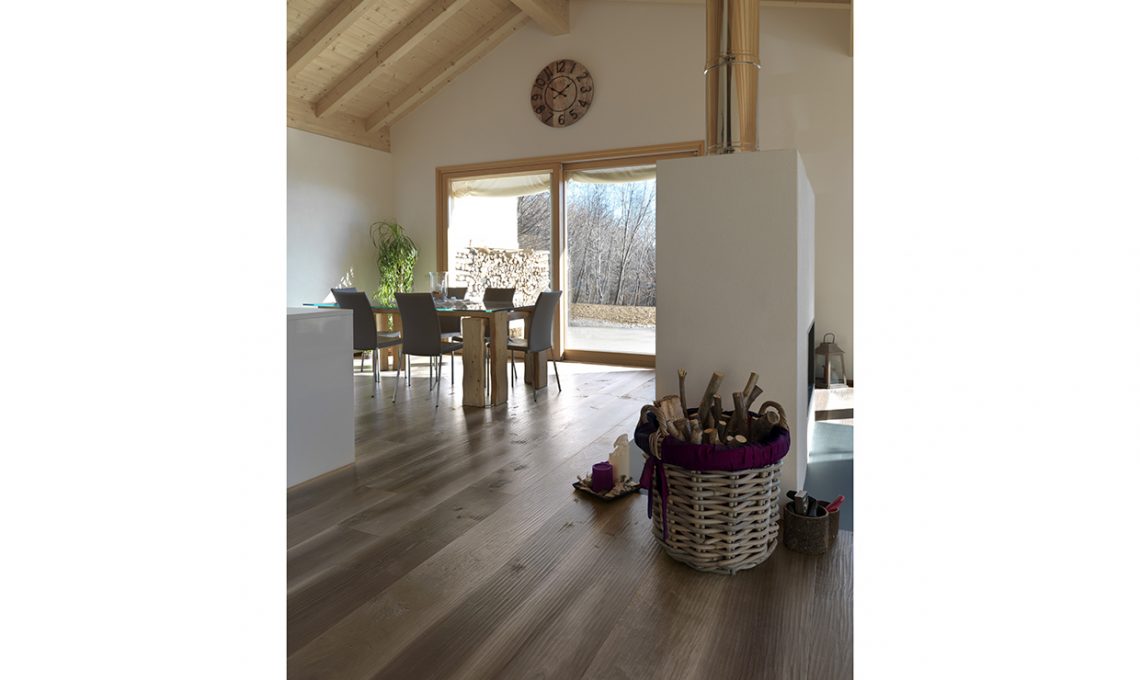 Ti troverai così a camminare su listoni solcati da spazzolature o da piallature, tagliati dai denti di seghe a nastro e opacizzati da vernici dalle cromie usurate ad hoc.