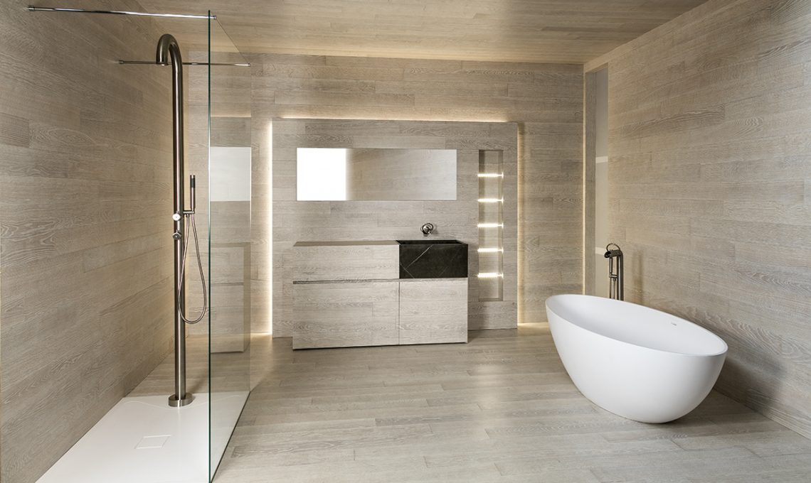 Itlas 5 millimetri è il rivestimento in rovere dal microspessore che, trattato in superficie con resine all’acqua, si posa su pavimenti, pareti e mobili di bagno e cucina [Itlas, cm 13/15x50/150 da €50/mq].