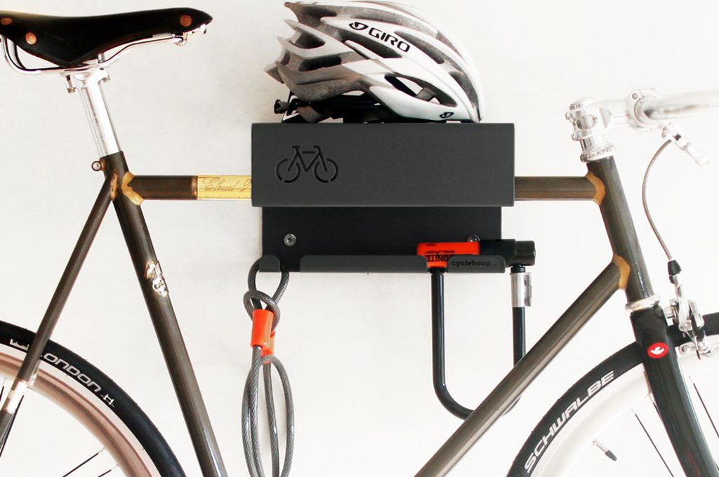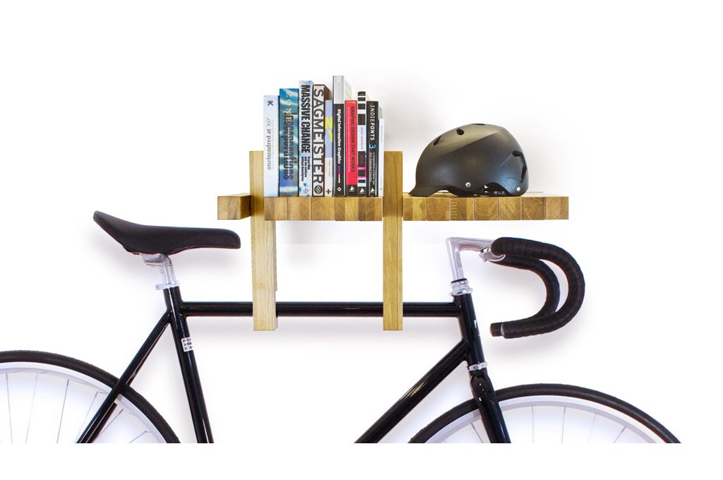 Bikeshelf sostiene la bici e tiene in ordine gli accessori, è disponibile anche in rosso, azzurro, verde, arancio e bianco (Ciclehoop, cm 30x33x18h da € 90)