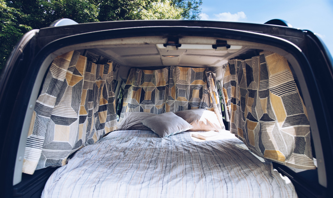 A questo punto avete quasi tutto ciò di cui avete bisogno, vi manca solo un po’ di privacy, sia per quando dormirete, sia per esempio per quando dovrete cambiarvi. Avete bisogno di mettere delle tende. Prendete le misure in modo da sapere di quanto tessuto avrete bisogno per riuscire a coprire i finestrini. Create tende che si possano facilmente aprire e fissatele per quando dovrete guidare così da non limitare la visuale.
