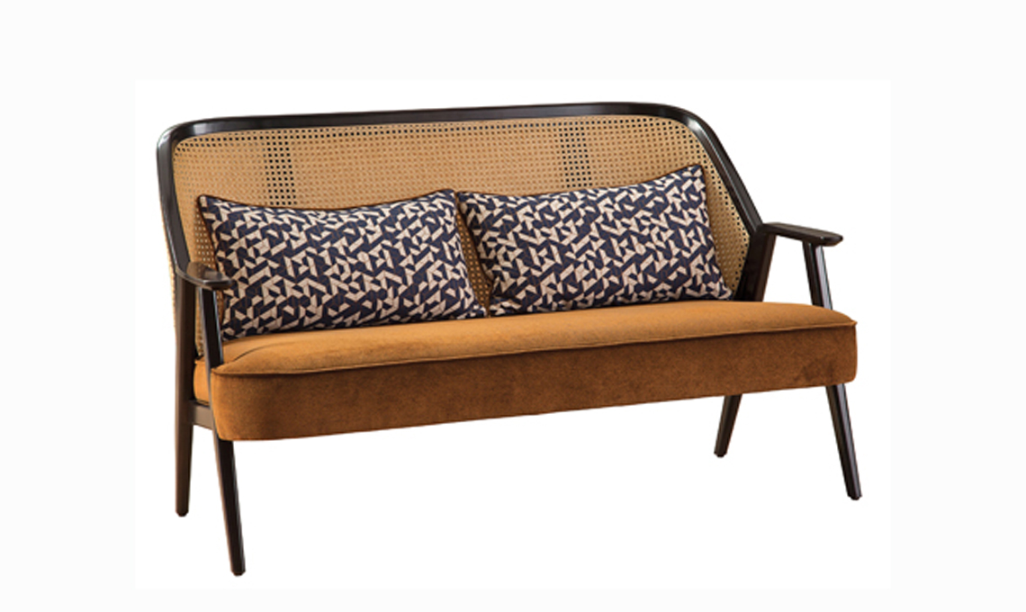 Weg è il divanetto con schienale in paglia di Vienna e seduta in velluto [Roche Bobois, cm 140x74x80h]