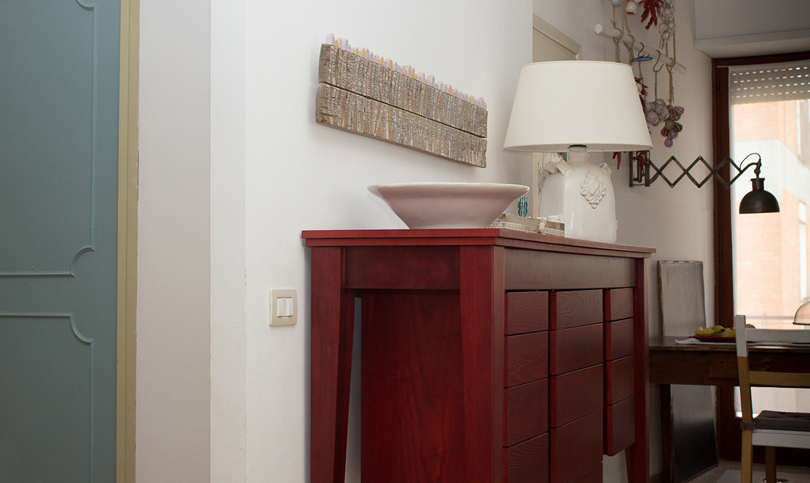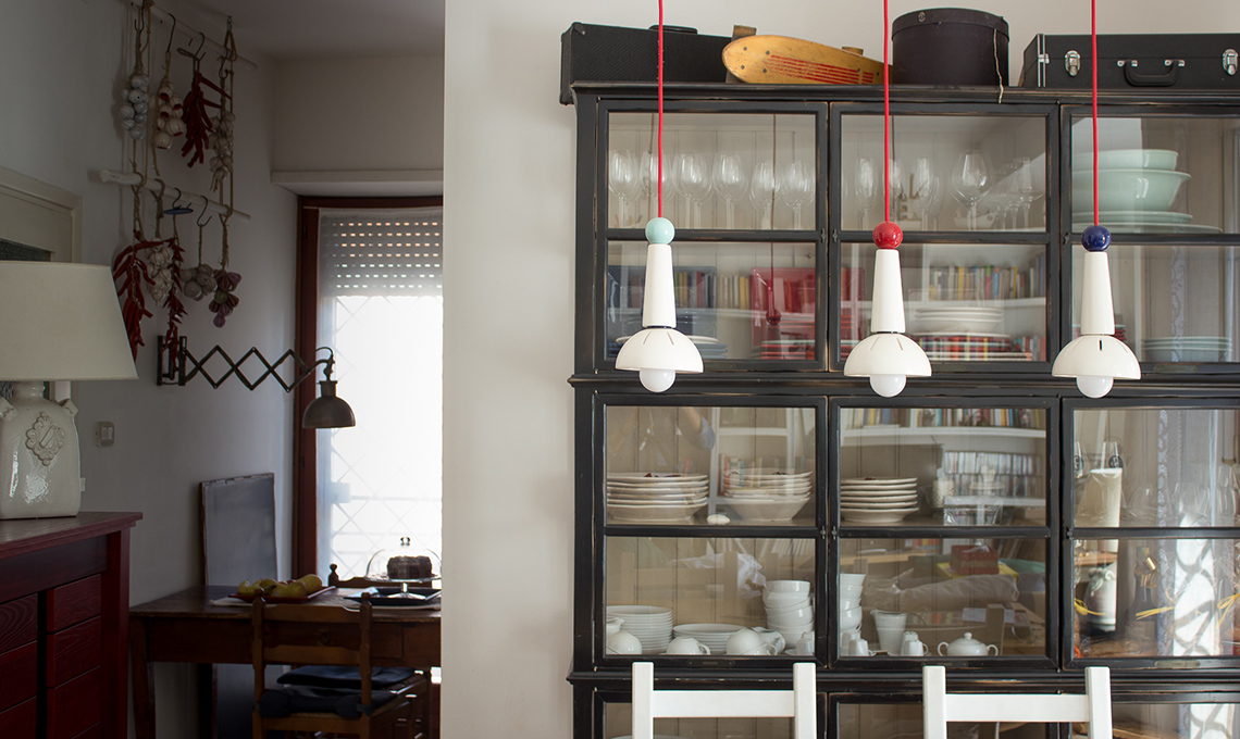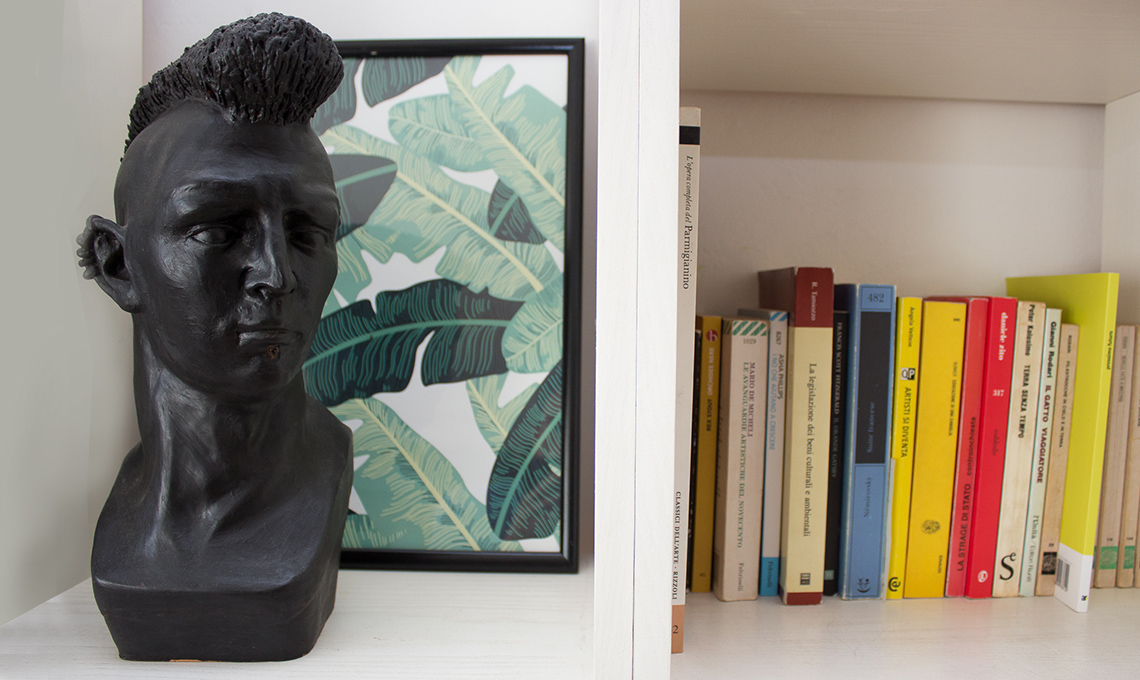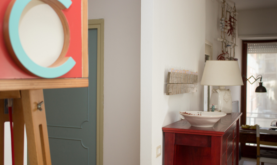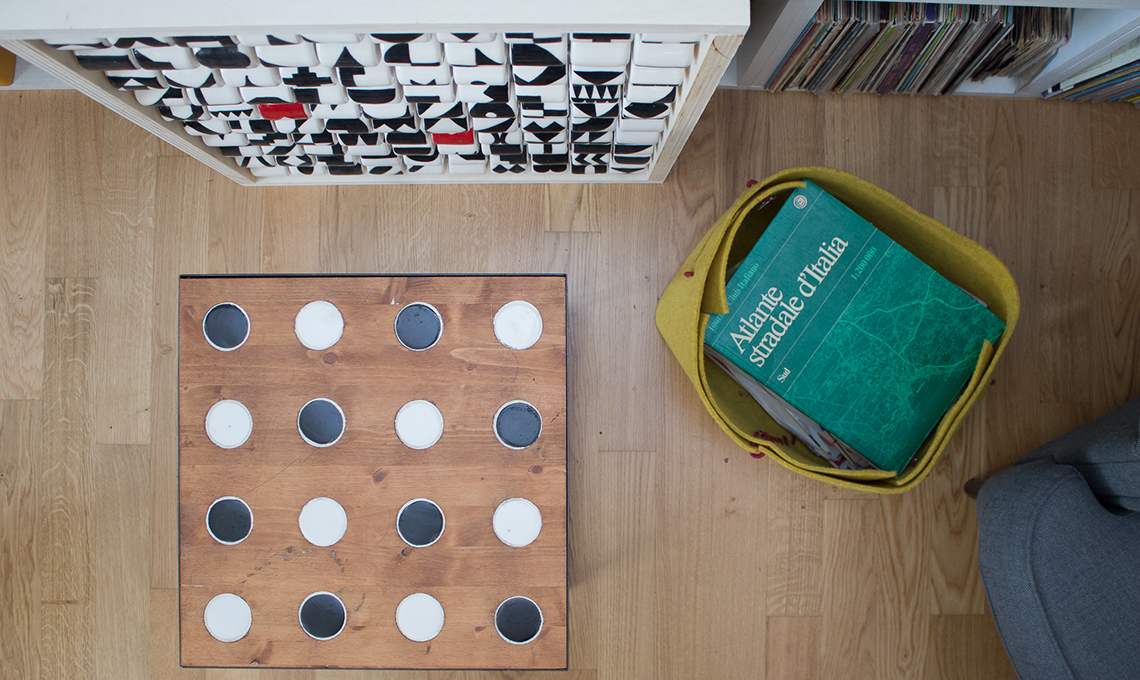 Uno spazio polifunzionale, quindi votato alla praticità, perché il nostro lavoro in parte si svolge anche qui, con uno stile un po’ nordico, colorato e molto Gualandi. Ci piacciono i colori, i materiali “caldi” e antichi, le geometrie e i formati maxi, il modernariato. Non troverete mai nella nostra casa minimalismo estremo, atmosfere nostalgiche o vintage, plexiglass, acciaio, resine, plastiche. Abbiamo arredato con diversi pezzi progettati da noi, alcuni dei quali li abbiamo anche venduti e altri realizzati esclusivamente per casa: librerie, tavolini, consolle, lampade, sculture, oggetti vari e persino giocattoli. Qualche arredo lo abbiamo trovato e ci siamo dovuti adattare, come la cucina ad esempio; piano piano interveniamo cercando, dove possiamo, di sostituirli o renderli integrabili con il resto.