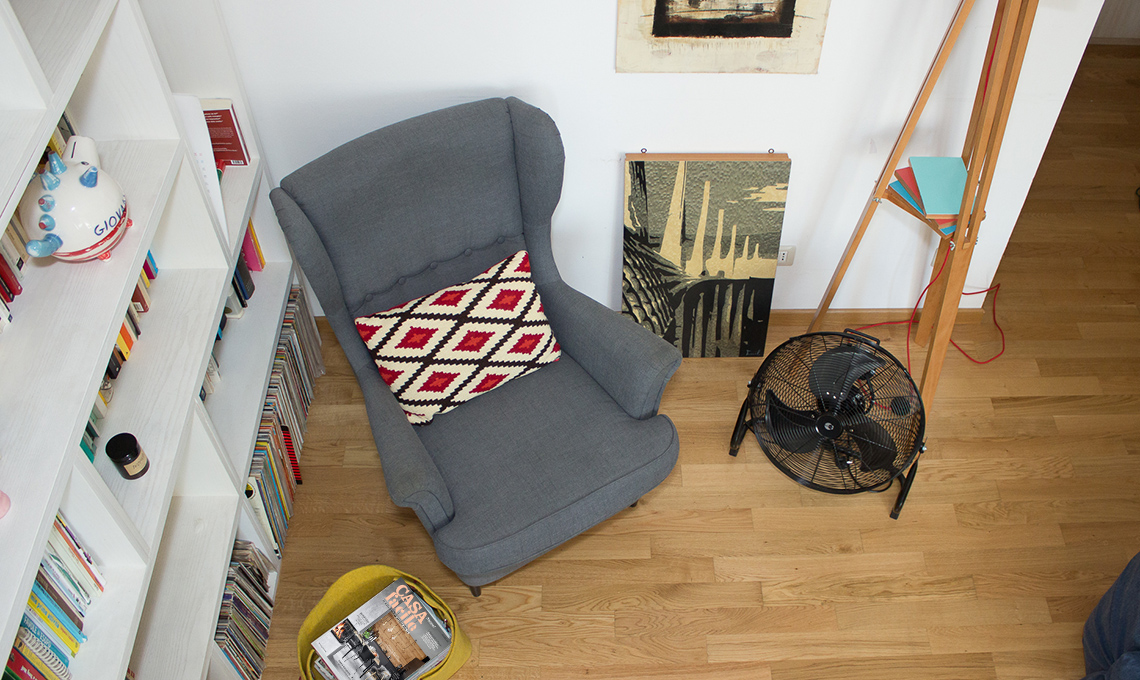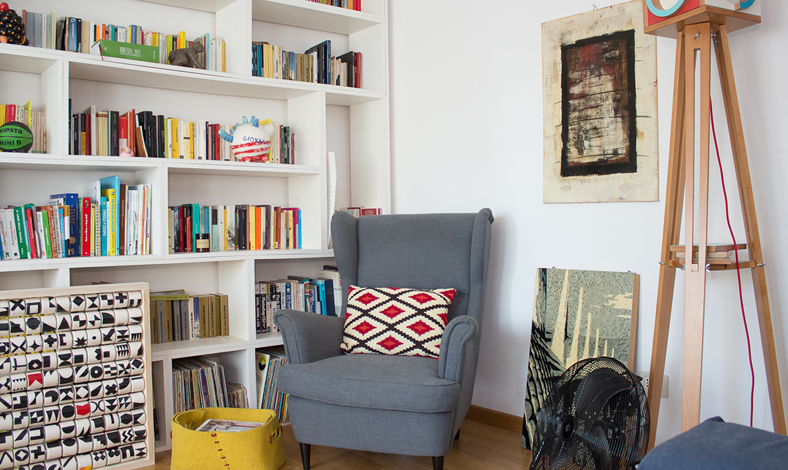 Tanta luce naturale. Un tavolo enorme oppure in alternativa, se non si dispone di spazio sufficiente, tanti piani come nel nostro caso. Numerosi punti luce. Una grande libreria bianca. Cuscini, anche prima del divano. Un minimo di ordine, quello un po’ ci manca.