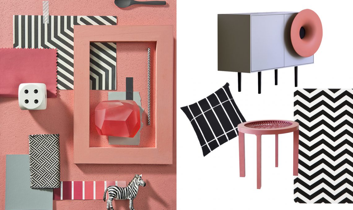 Le nostre stylist di Studiopepe hanno realizzato questa moodboard accostando le sfumature del rosa geranio al grafismo del bianco e nero:
