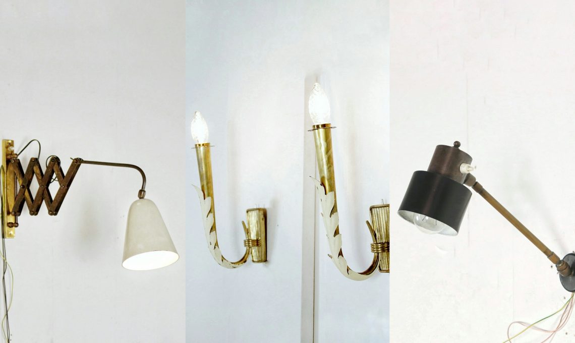 Lampada a parete estensibile anni ‘50in alluminio laccato e ottone €380, coppia di lampade a parete. Alluminio laccato, ottone. Anni ’40 €180, lampada a parete orientabile mediante snodo; ottone, alluminio laccato anni ’50 €200 [tutto su di mano in mano]