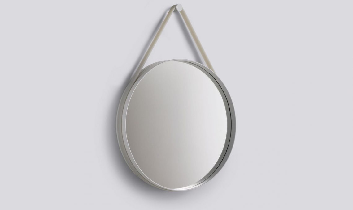 Uno specchio tondo ispirato alle linee anni Settanta, che si appende alla parete grazie a una cinghia di silicone disponibile in bellissimi colori pastello: rosa, verde menta e giallo [Strap Mirror di HAY - hay.dk]