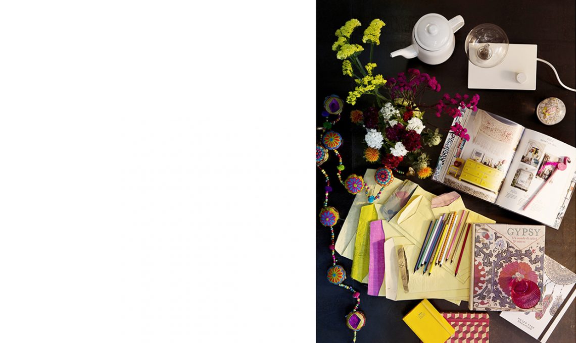 Vanessa ha allestito una moodboard: un mazzo di fiori semplici (non esiste gipsy senza un tocco ’green’), matite, fili di perle décor e il libro della stylist australiana Sibella Court, guru dello stile ‘nomade’ nell’home décor.