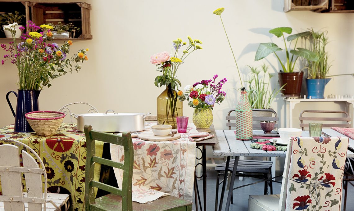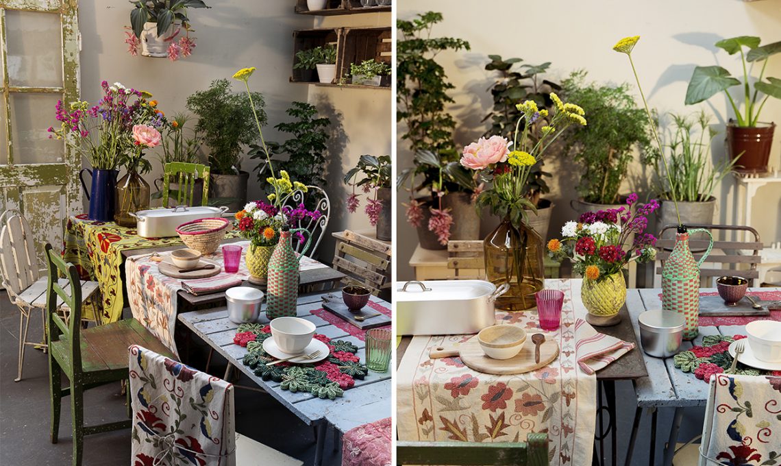 L’allestimento per un brunch alternativo: sedie vintage [All’Origine, da €75]; piegato sullo schienale, runner [Ozbeki Suzani €84]; tovaglietta in paglia Margherita [Seletti €49] , scodella e piattino in bambù biodegradabile [Bitossi Home], stampo per cassata [Italo Ottinetti]. Vaso giallo [Serax €15], posate Linea Oro [Mepra]; cestino in paglia con filo fucsia e scodelle in legno [Cargo]. Pesciera [Italo Ottinetti], caraffa blu [All’Origine], tovaglia [Kilim Suzani €310].