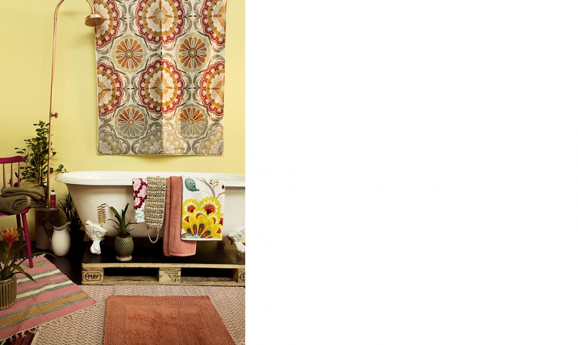 La vasca smaltata old style, così non l’avevamo mai vista: circondata da piante e stole etniche, ci lancia subito in un sogno tropicale [Cargo, cm 170x76x58h €1.250]. Asciugamani Floral [Pip Studio], tappeto corallo [Fazzini cm 50x80 €22,50]. Vaso [Serax], tappeto in juta e con motivo a righe [Jute&Co]. Sedia [Cargo €119] e doccia [Seletti, cm 220h €110].
