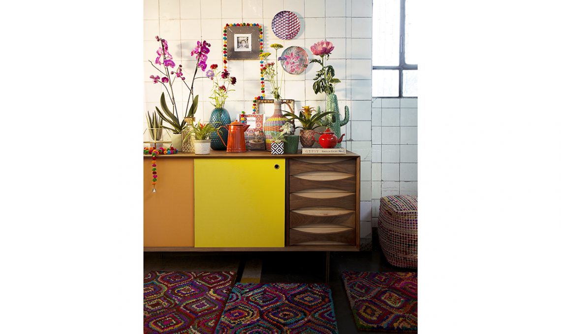 Sulla credenza [Cargo, cm 153x45x58h €1.890] è ricreato un angolo ‘jungle’ che gioca con la materia: ceramica, latta, vetro, paglia intrecciata. Vasi cactus [da €13] e Marie Small in cemento di [Serax]; teiera e fiasco multicolore [All’Origine €49 e €59]; porta-candela in vetro [J-line €29,90]. A parete, piatti [Miho], ghirlande [Pomax], tappeti [Rug Republic €49 cad].
