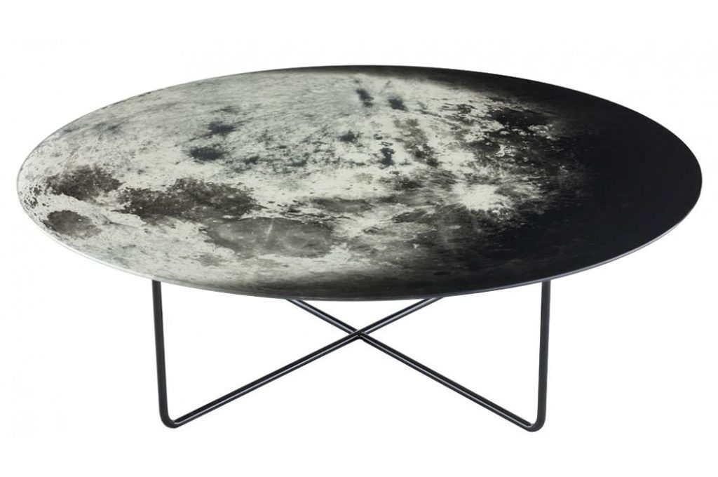 La luna è stampata su una superficie a specchio nel tavolino My Moon My Mirror [Diesel with Moroso, ø cm 100x29h € 840]