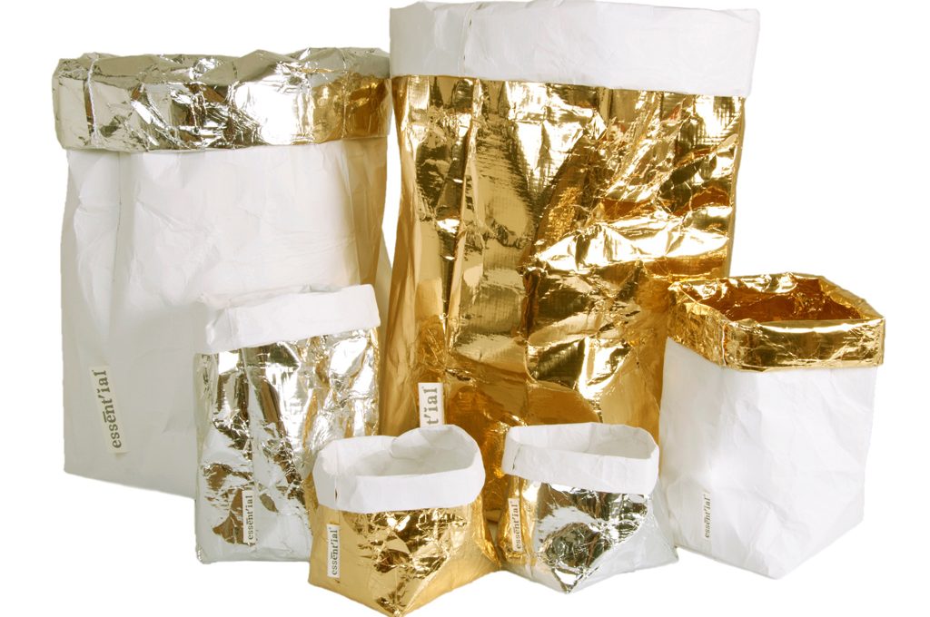 Tecno-ecologici i sacchetti in carta con interno o esterno in oro [Essent’ial, da cm 13x9x10h da €9,50]
