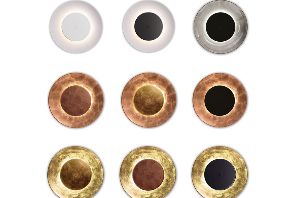 Effetto ‘eclisse’: con una semplice pressione sul disco frontale si regola la luce nella lampada da parete Lunaire. In 9 finiture [FontanaArte, ø cm 75 da €645].