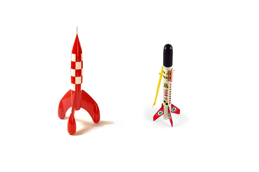 Da sin., il razzo di Tintin, in resina [La marque Zone, cm 35h €199]; il missile con paracadute Tor: dagli Anni ’60 si lancia con la fionda [Quercetti, cm 21h €12,90]