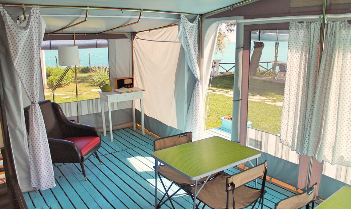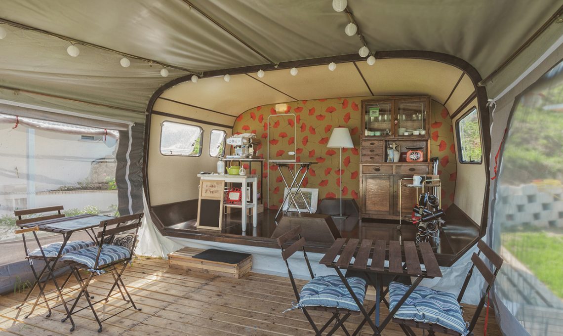 Un b&b davvero speciale con quattro camere confortevoli, tipo bungalow, e un punto di ritrovo all'aperto, per la prima colazione, a dir poco unico, che dona un senso di magia e libertà alla vacanza. Il guscio svuotato della roulotte rétro è ampliato dalla veranda, dove tavolini e credenza sono di recupero.