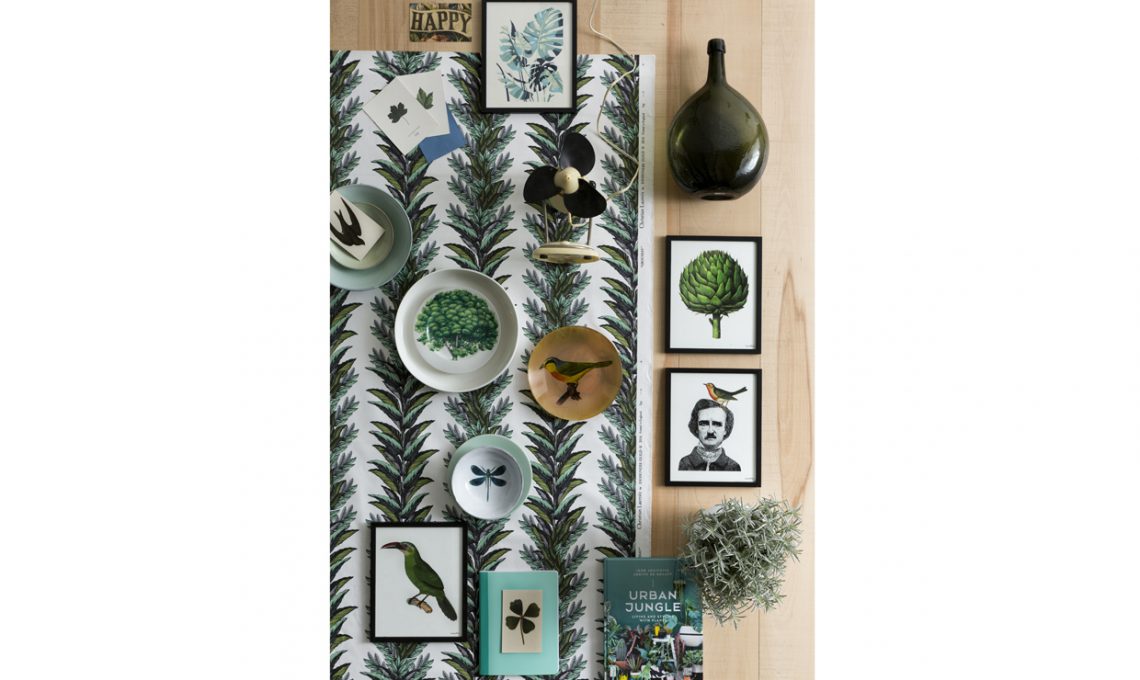 La moodboard: tessuto Groussay [Christian Lacroix per Designers Guild]: cartoline e piattino con libellula [Astier De Villatte da Raw], quadretti [Vanilla Fly], piatti verdi [Serax], fiasco e ventilatore [All’Origine], piatto con albero [Taitù], quaderno [Flying Tiger], libro [» amazon.it], parquet [Itlas]. Styling Vanessa Pisk ed Elisabetta Viganò, foto Giandomenico Frassi.