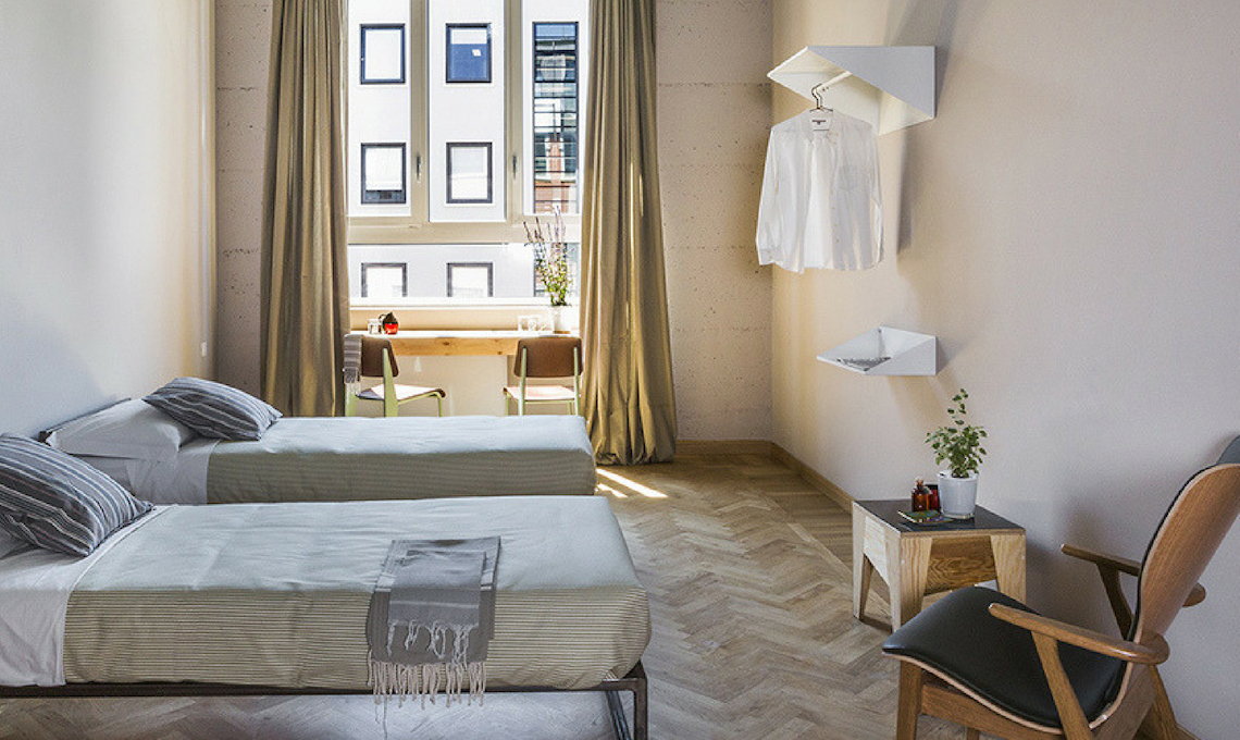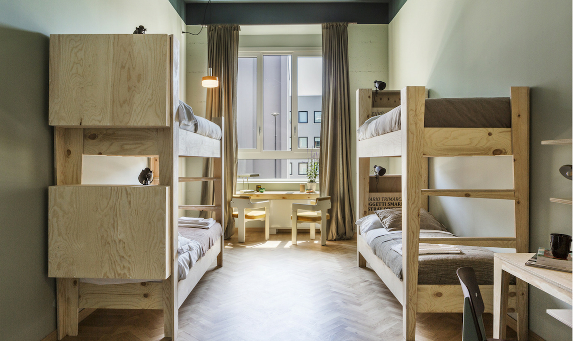 Accanto al design iconico troverete anche elementi appositamente disegnati per BASE e realizzati artigianalmente da designer italiani come Leftover e Mezzo Atelier (letti singoli, doppi e a castello, panche, scrivanie...). Per le pareti, diverse in ogni stanza, sono state scelte pitture dai toni profondi e polverosi.