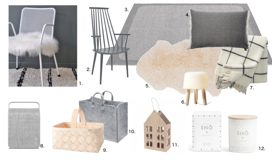 1. Cuscino in pelle di pecora tibetana [su Le Repére des Bellettes, €46], 2. sedia danese J110 [Hay, da €255], 3. tappeto in lana Pebble [Muuto, €1.095], 4. Cuscino in lana Dot di [Brita Sweden, €49,37], 5. Pelle di pecora color champagne di [Shepherd, prezzo dal rivenditore], 6. lampada Milk [&tradition, prezzo su richiesta], 7. plaid in lana Vinga [Klippan,€81,93], 8. speaker wireless Oslo [Vifa, prezzo su richiesta], 9. cestino in betulla Lastu [Verso Design, €79,90], 10. borsa in feltro sintetico Meno [Iittala, €93,49 ], 11. portacandele in legno naturale [Smallable Home, €19], 12. fragranza SNÖ [Skandinavisk,€35].