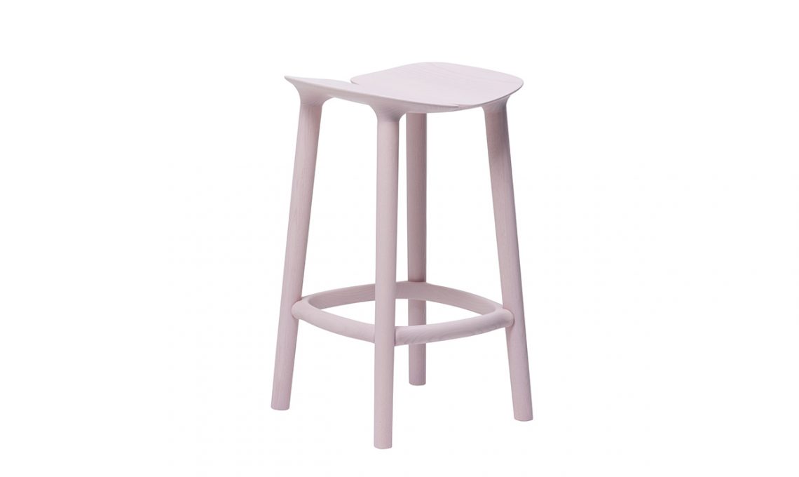 Delicatissimo il rosa dello sgabello Osso, in frassino tinto all’anilina rosa cerata, disegnato da Ronan & Erwan Bouroullec [Mattiazzi, cm 41x41x65h €682].