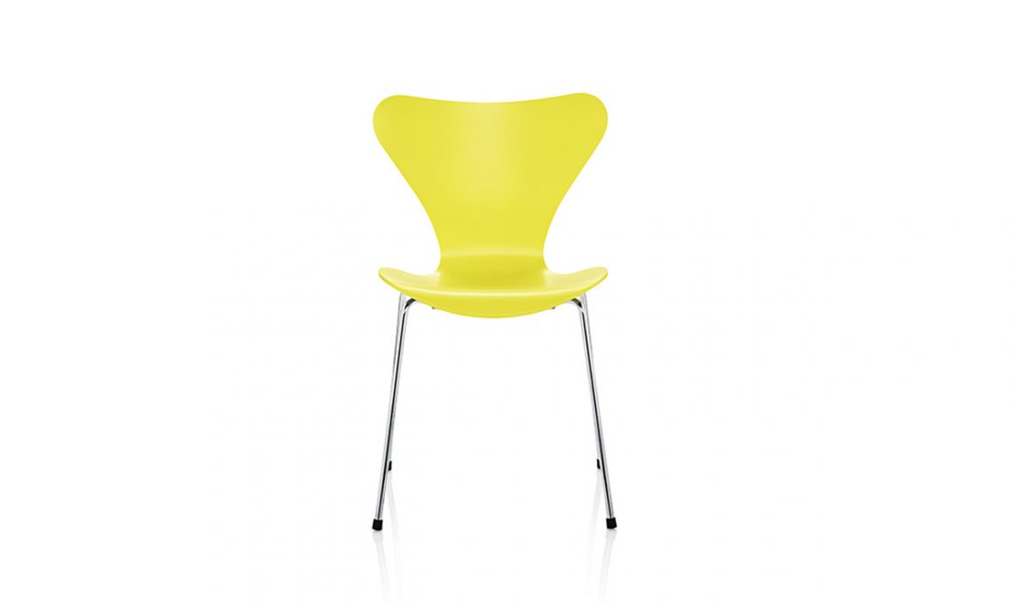 Ormai un classico del design: la sedia Serie7 disegnata da Arne Jacobsen ha gambe metalliche e monoscocca in multistrato curvato [Fritz Hansen, cm 52x50x80,5h prezzo da rivenditore].