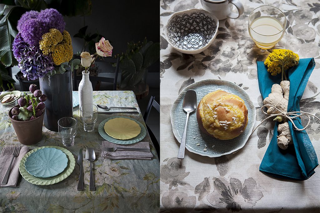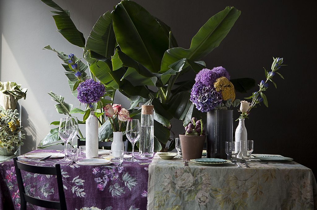 I tessuti floreali sono perfetti da mescolare, come i fiori in un mazzo! Qui la stylist ha creato una tovaglia abbinando il tessuto Caprifoglio nelle versioni Damson (a sinistra) e Floreale-Celadon (a destra) [Designers Guild]. Caraffa con tappo di sughero e bottiglie [Menu], posate [KN Industrie].