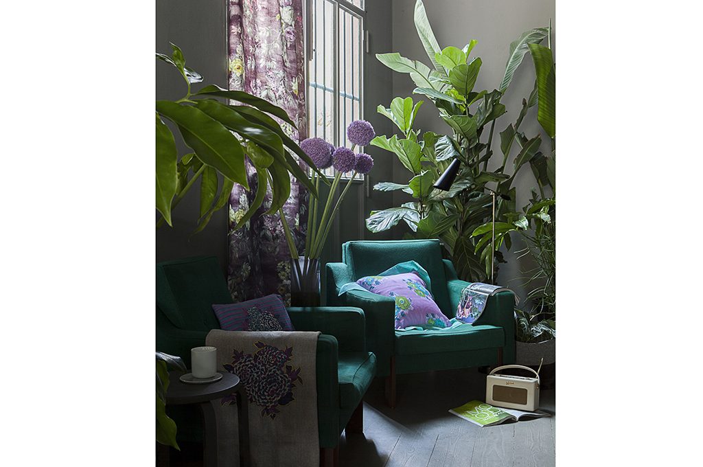 Raggruppare le piante come in un bosco crea un angolo relax speciale. Cuscini e plaid [Lisa Corti]. Tenda: tessuto Caprifoglio Damson [Designers Guild]. Radio Revival R260 di Roberts Radio [distr. Da Phorma].