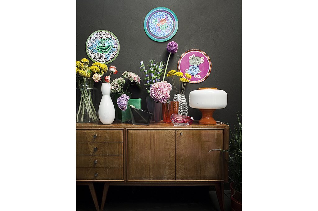 I sideboard, i mobili bassi (stile) Anni ’50, sono ideali per creare composizioni di fiori. Nei vasi [Purho], rose cerate, achillea gialla, rami di genziana e ortensie. Alle pareti, sottopiatti [Lisa Corti].