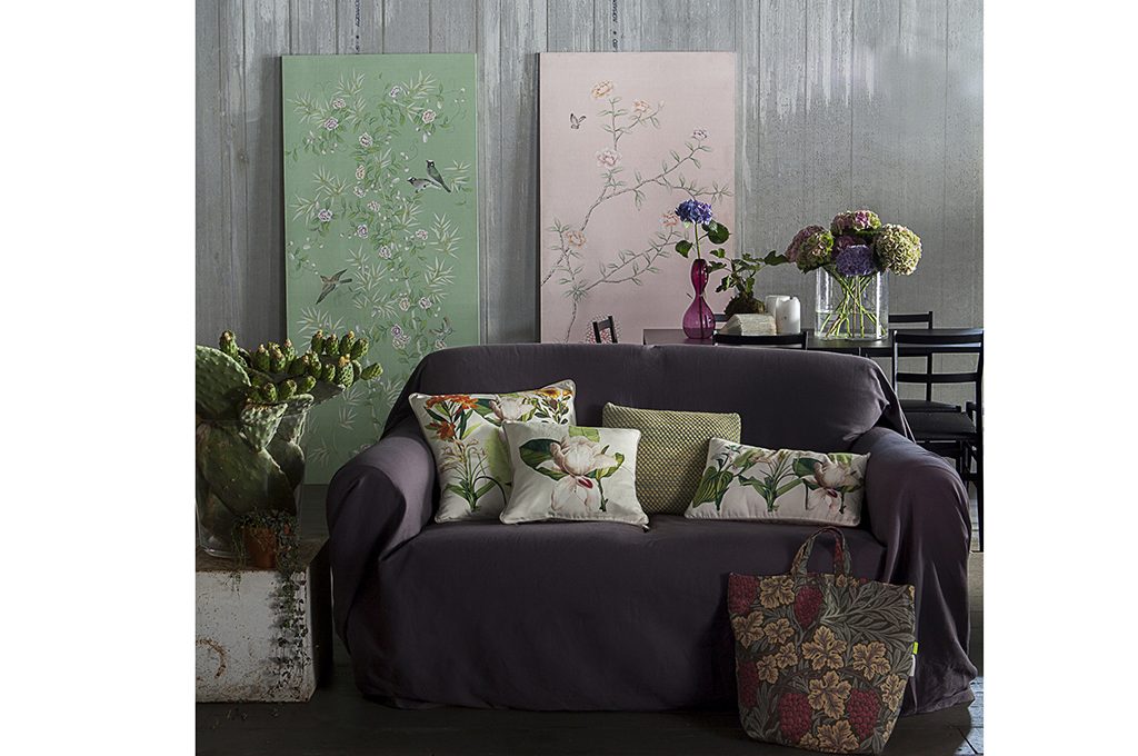 Sul divano i cuscini floreali [Zara Home] e in tela tricot [Roberta Licini] insieme alla borsa in tessuto [Morris&Co. in vendita da Potafiori] creano un pot-pourri di forme vegetali.