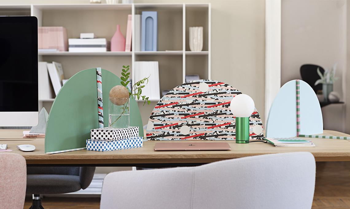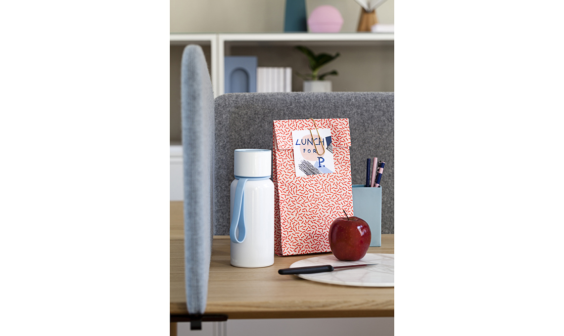 Nascosti dal divisorio del tavolo Wing [True Design], bottiglia To Go Acqua [Stelton, 0,75 l, €19,65], vasetto portamatite Cube [Asa Selection €9,55], matite [Normann Copenhagen €11/8pz], sacchetto fatto con un foglio di carta [Write Sketch&].