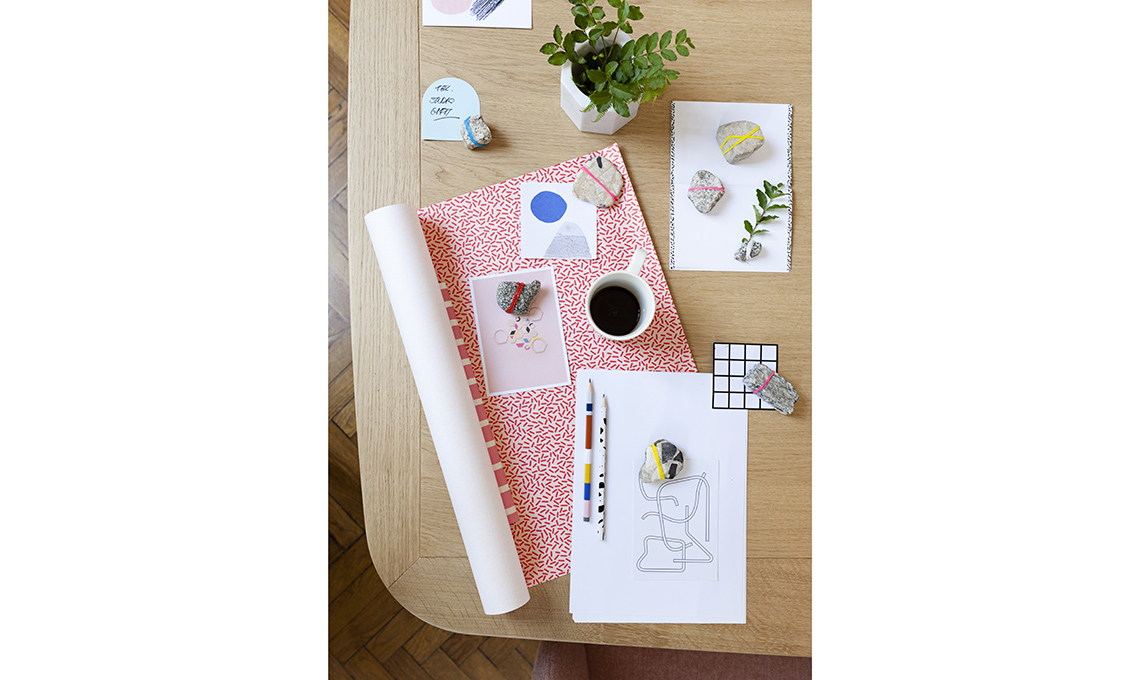 Ellipse in resina [Alessi €50/set 2pz], portacarte in marmo [€214 il set con porta-smartphone e portapenne] di [Scandola Marmi] come il vaso ottagonale in marmo bianco di Carrara matite, penna a righe e gomme [Flying Tiger e Design Republic]. Quaderno A5 con copertina dai pattern geometrici nei