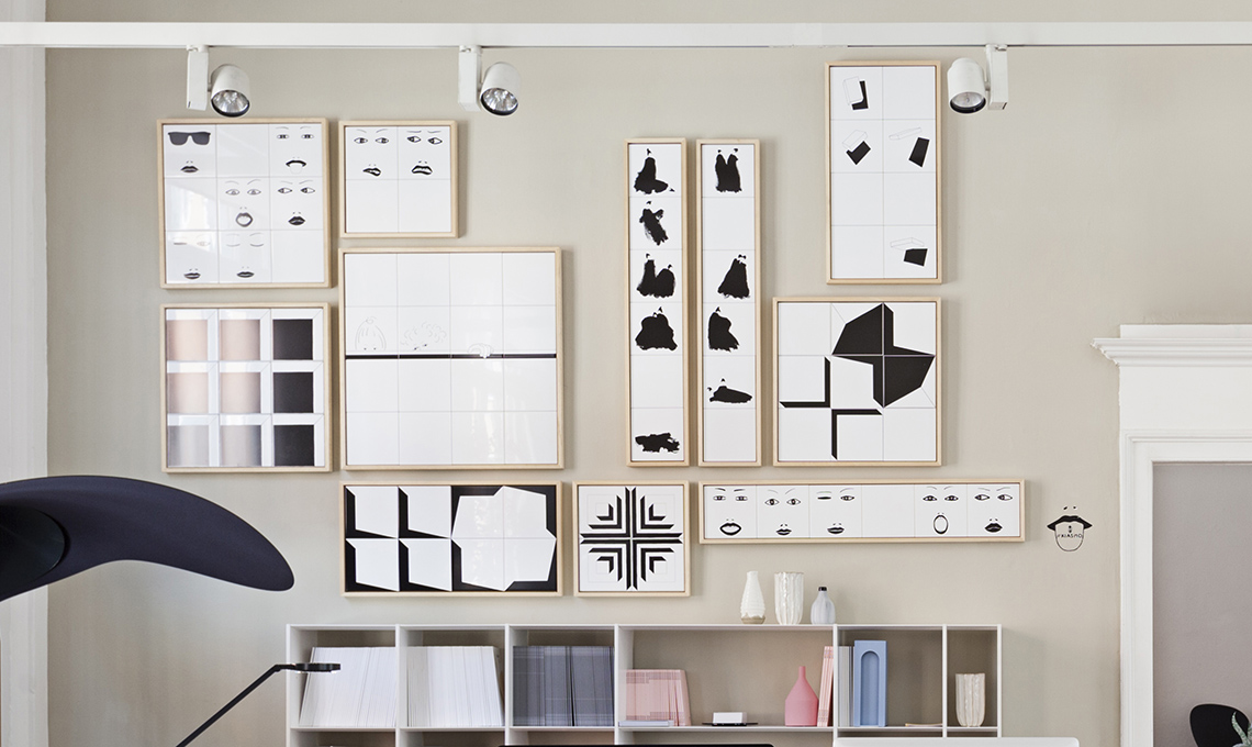 il portadocumenti azzurro [Design Republic]. Sopra, spicca la grafica b&w di ceramiche handmade, incorniciate