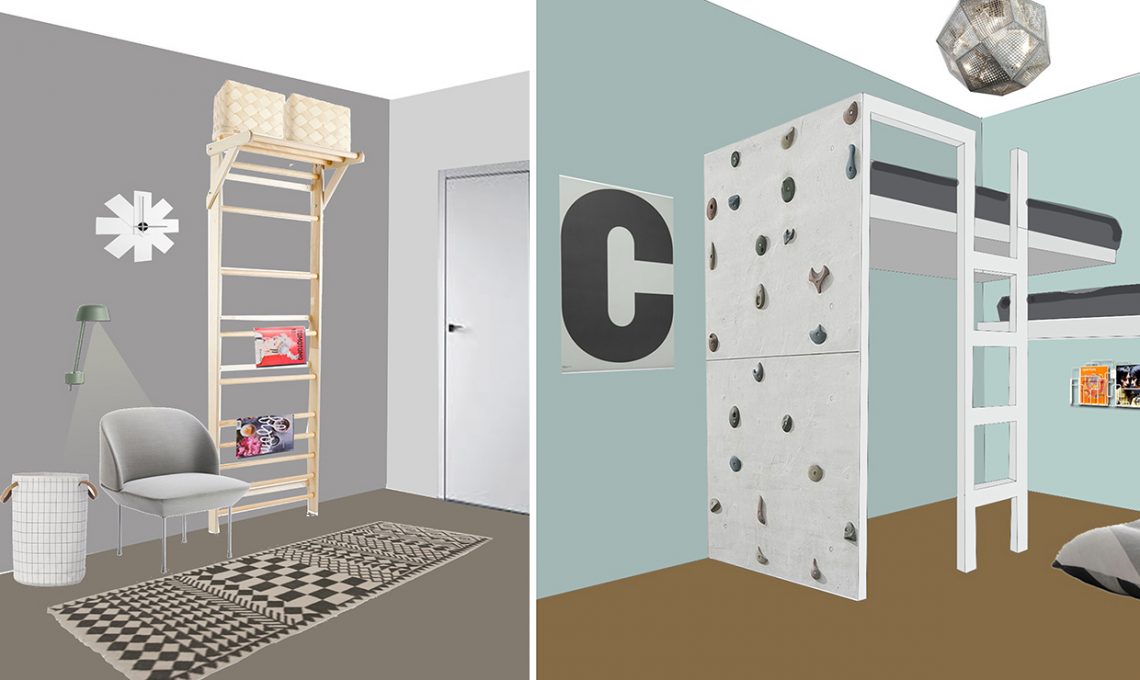 3 Mini-rocciatori in cameretta: vuoi realizzare un angolo gioco un po’ insolito per i bambini? Puoi attrezzare una parete – o un lato del letto a soppalco o a castello. Ovviamente, calcola l’altezza delle prese in base all’età e al fisico di tuo figlio e, per sicurezza, lascia un materasso sotto!