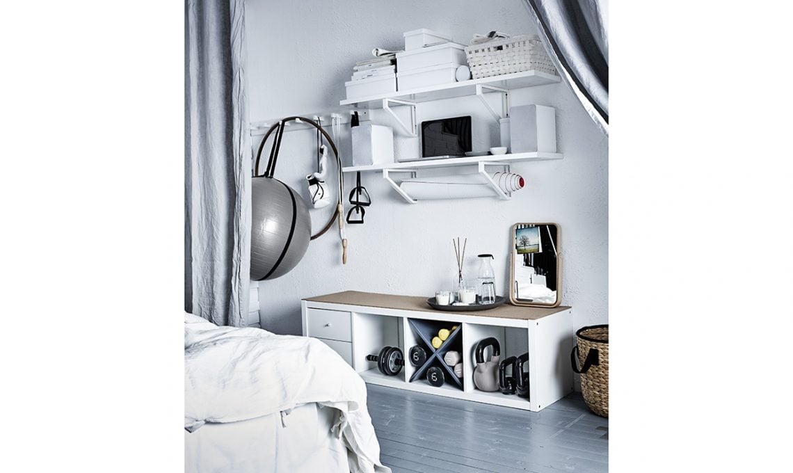 Basta una porzione di parete per ricavare anche in camera da letto il tuo angolo fitness. Appendi gli attrezzi più leggeri all’attaccapanni [Kubbis, €12,99]. Metti quelli che usi meno in scatole su una mensola alta. Nelle staffe [Ekby Lerberg, €3 l’una] delle mensole ci sta il tappetino arrotolato; pesi e manubri, invece, riponili in uno scaffale a terra [Kallax, €49,99] attrezzato con vani a giorno e cassetti. Tutto [Ikea].