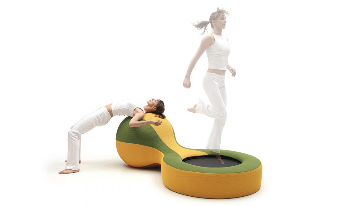 È così bella che puoi tenerla a vista nel living, la pedana per il salto Sneaker, con estremità gonfiabile per gli esercizi di allungamento della schiena [Campeggi, cm 225x110x42/80h €1.035].