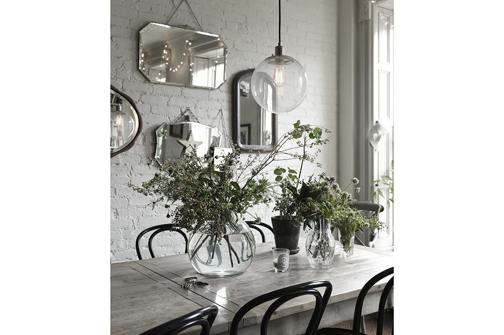 Una collezione di bottiglie trasparenti è perfetta per ospitare lo stesso tipo di fiori. Il gioco qui è la ripetizione