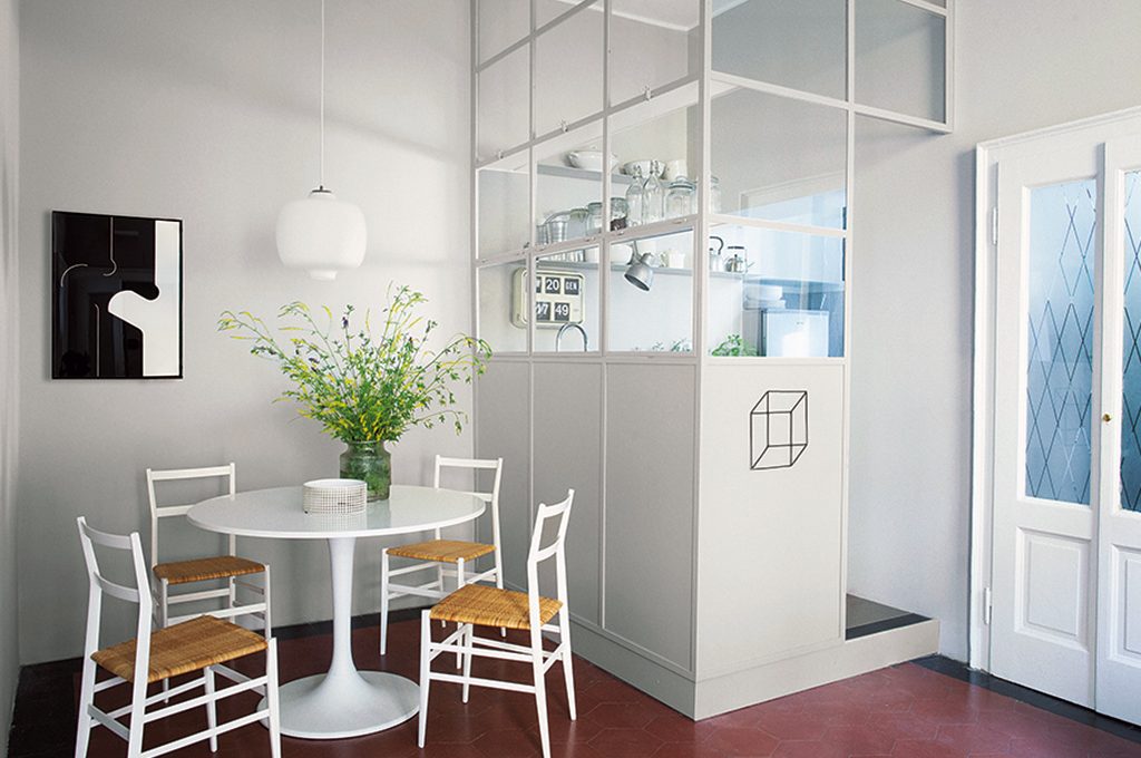 L'angolo pranzo è attaccato alla piccola cucina e diventa autonomo grazie a una vetrata che lo isola dal living vero e proprio. Risultato: si pranza in intimità senza però trovarsi chiusi in uno spazio angusto