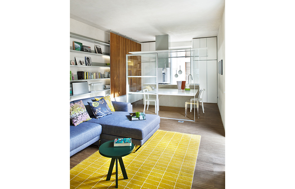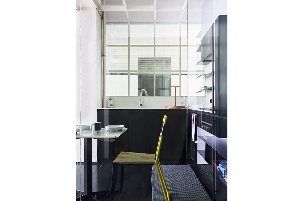 Il cucinino è veramente mini, ma anziché lasciarlo a vista sul soggiorno si è scelto di isolarlo: la "cabina vetrata" crea a tutti gli effetti una stanza in più, senza rubare luce né spazio!