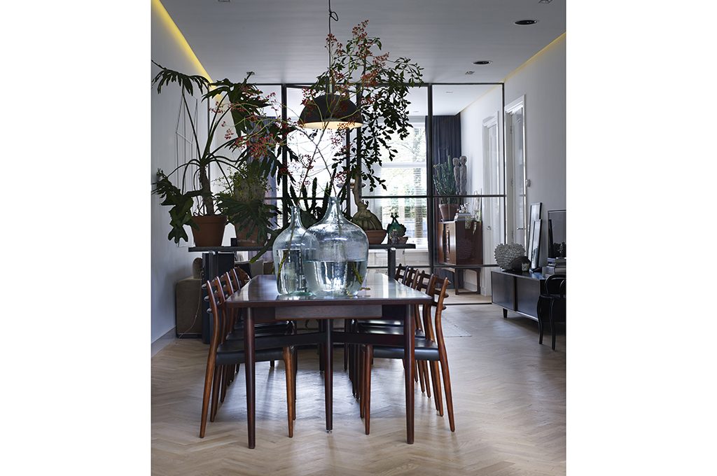 Qui l'esigenza era dare privacy alla zona dei divani e a quella da pranzo senza però ostacolare la luce. La parete vetrata non solo risponde a queste esigenze, ma con i profili neri aggiunge un tocco geometrico che arreda