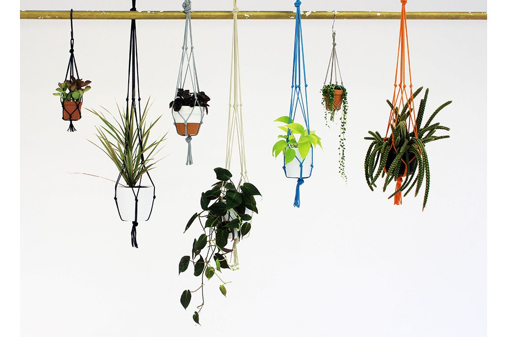 Vasi e piante sospese, disegni botanici su piatti, tessuti, carte da parati.