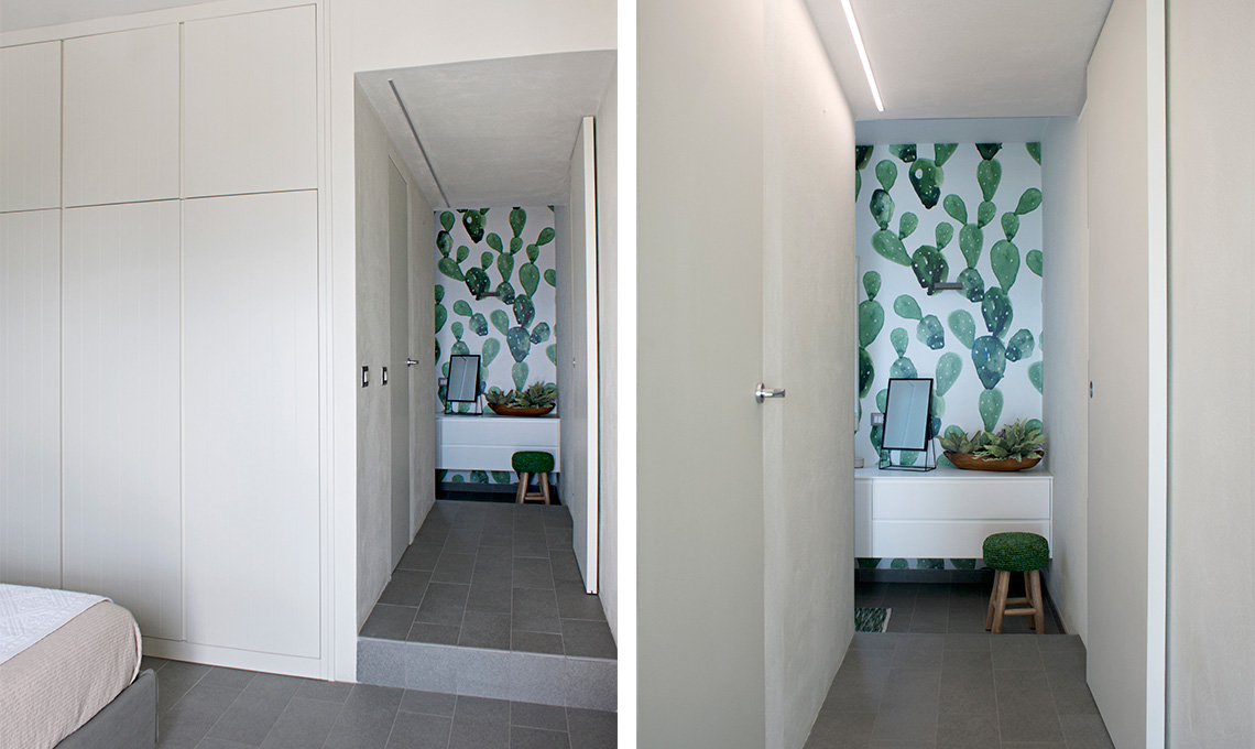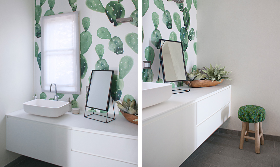 Elemento caratterizzante dell’appartamento è sicuramente la carta da parati con tema “pianta grassa” utilizzata per arredare e dare movimento alla parete principale dell’antibagno, perfettamente in armonia con la stessa tipologia di piante presenti nel giardino privato dell’abitazione.