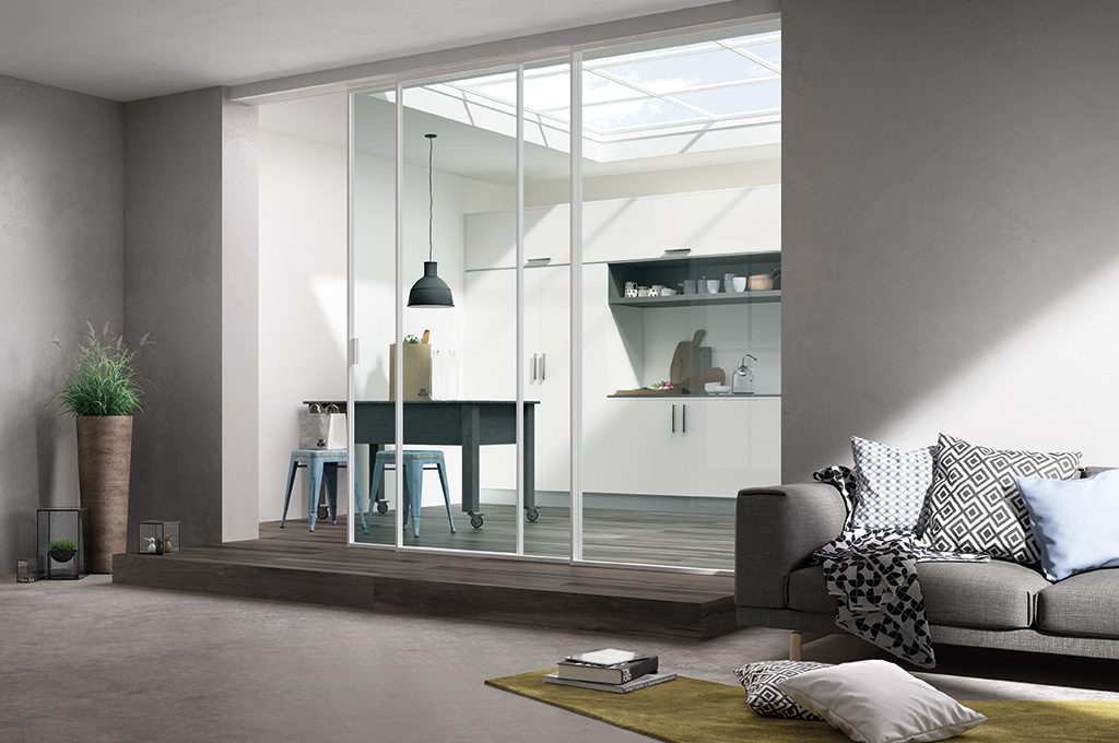 COME SI FA? Basta separare lo spazio con pareti scorrevoli a vetro: maxi-ante vetrate (nelle foto alcuni modelli) che delineano l’ambiente ricavando angoli dedicati, senza incidere sulla luce, le visuali e i percorsi.