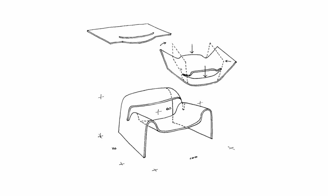 Nel 1985, durante lo sviluppo di alcuni modelli per Fiam, il senior assistant di Cini Boeri, l’architetto giapponese Tomu Katayanagi, le mostra uno dei suoi magici modellini di carta e subito si capisce il potenziale di quell’idea: la forma sinuosa, data dalla lastra tagliata e intagliata, curvata e piegata proprio come un kirigami giapponese. Insieme ne verificano le dimensioni, sistemano il disegno dei profili e la perfezionano, per proporla a Vittorio Livi, patron di Fiam.