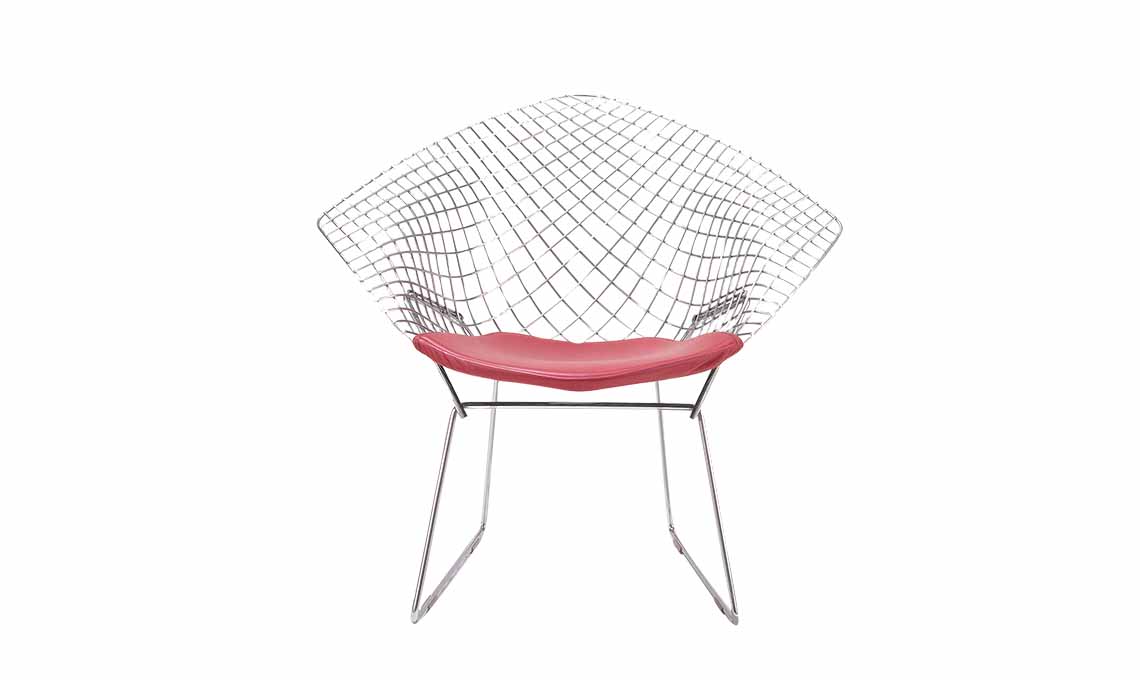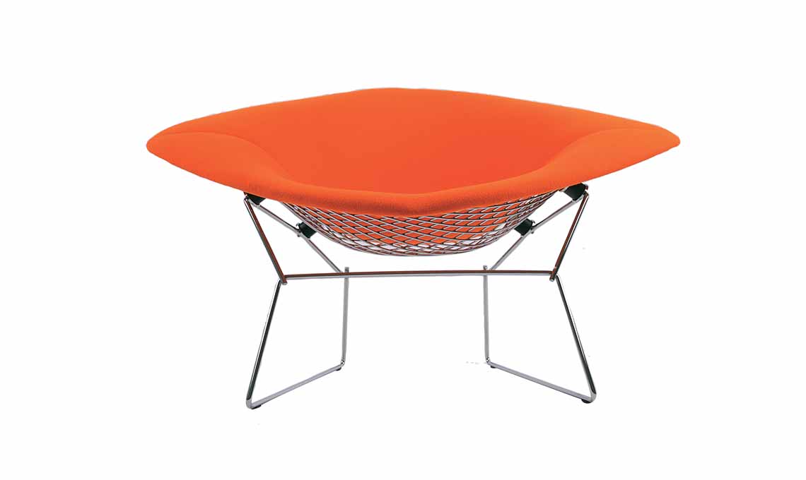segni particolari: nel progetto originale di Bertoia non si prevedeva cuscinatura; ma i discreti cuscini sagomati non ‘intaccano’ la struttura e la rendono più fruibile.