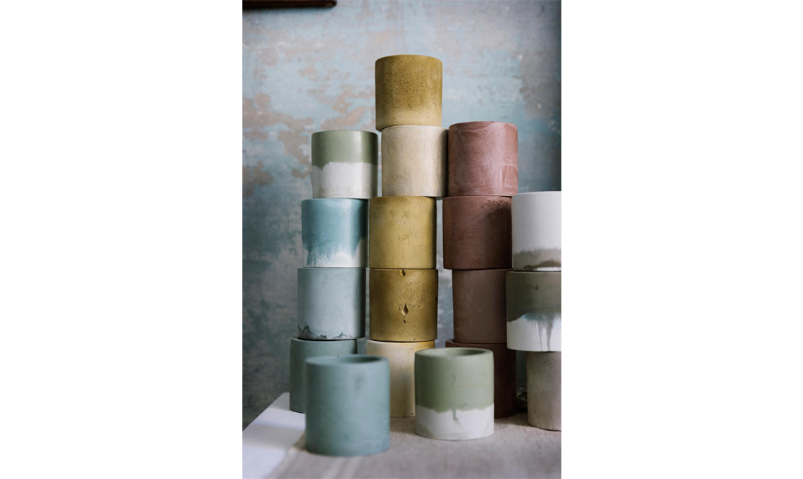 Collezioni. I vasetti in cemento pigmentato in massa, realizzati a mano, ospitano candele in cera di soia profumate (in collaborazione con Vivo Profumi). Sulle imperfezioni del cemento le colature di colore sfoggiano una palette sofisticata. Da copiare!