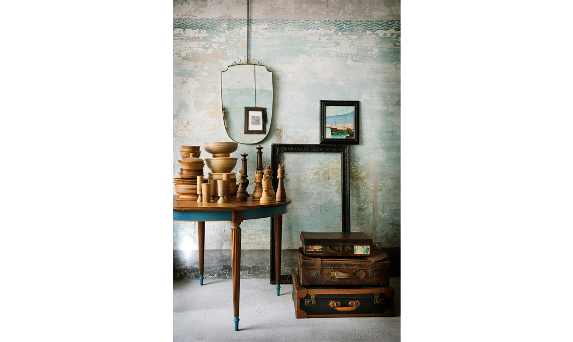 [1] La sovrapposizione di cornici e lo specchio rétro bilanciano il tavolo affollato dalla collezione di oggetti décor in legno. Tavolo stile Luigi XVI restaurato, valigie, cornici e specchi anni ’40, ciotole in legno Turned Wood Collection [Emporio Mikica]