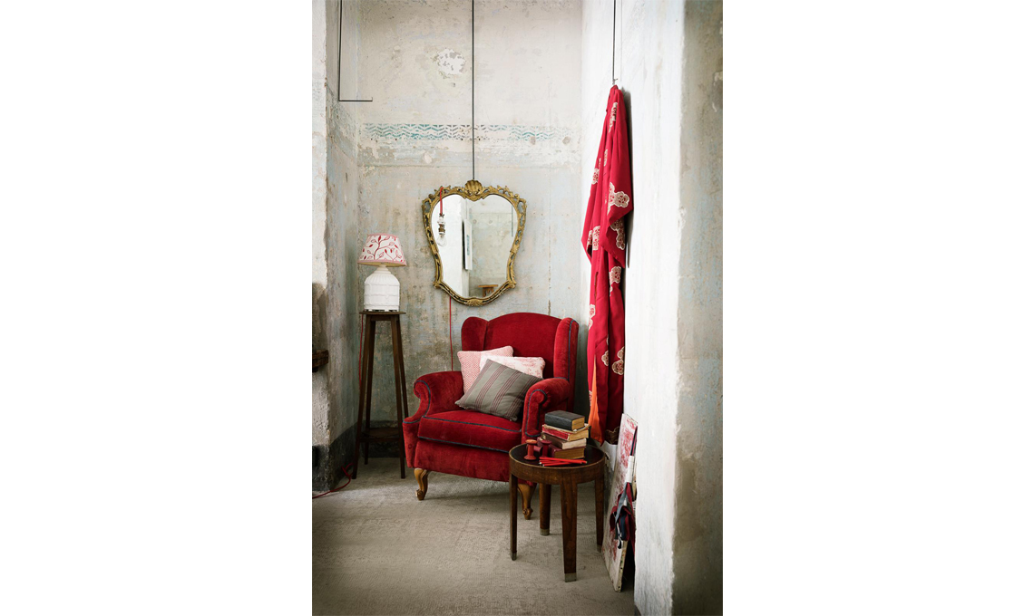 [2] Il tocco chic. Lo specchio barocco, la bergère di velluto e il kimono di seta in rosso creano un angolino d’altri tempi. Poltrona bergère con velluto Rubelli, lampada Bambù con cappello dipinto [Emporio Mikica], kimono in seta [BUBU.tique per Emporio Mikica]