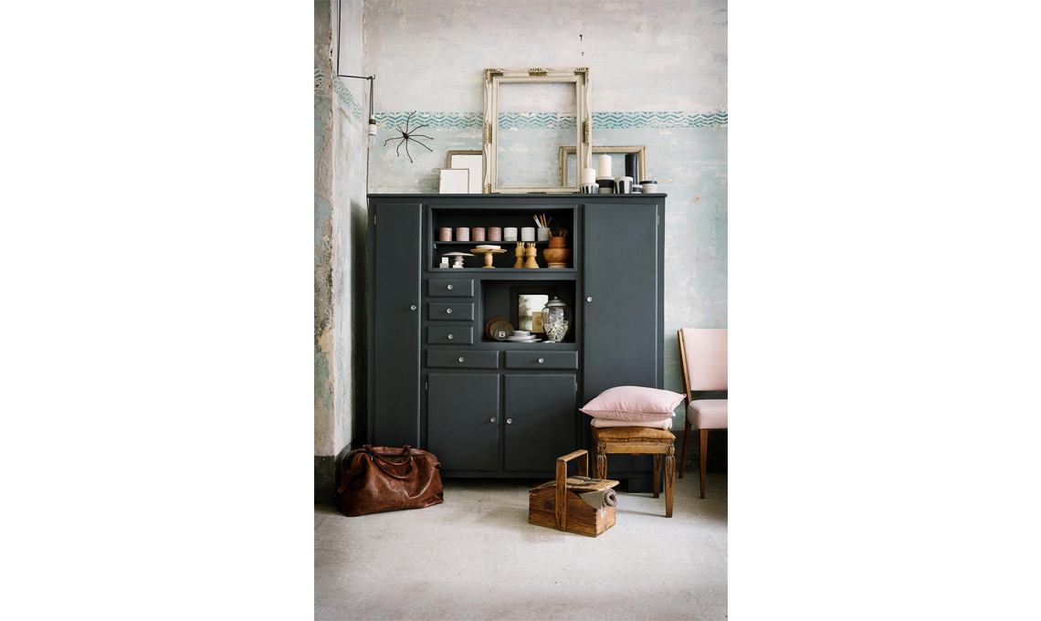 Il pezzo clou deve avere una tinta piena per risaltare sui muri vissuti. Ripristinate le mensole mancanti e ricostruito il cappello con profilo a becco di civetta, la ferramenta è stata ripulita dagli strati di vernice. Sul fondo aggrappante, lo smalto opaco per il legno: un grigio medio con l’aggiunta di pigmenti per ottenere un dark grey e rifinito a cera.