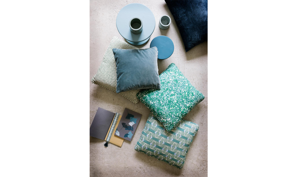 Raw&chic. Con la resina effetto cemento scegli cuscini d’arredo con micro pattern e in velluto a coste tinta unita. La palette nei toni freddi dei verdi acqua e dell’azzurro polvere è il match perfetto con il grigio del cemento.