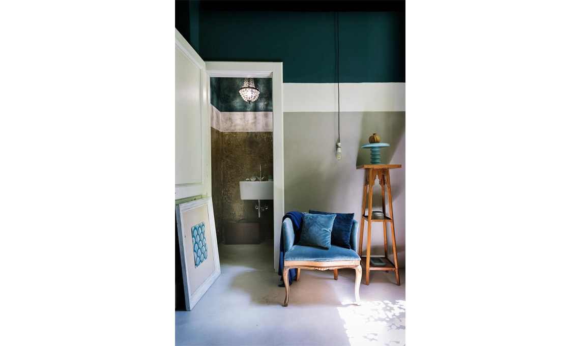 Nell’intervento di restauro delle pareti, sotto l’intonaco tolto a mano, i colori e i decori originali degli Anni ’20 sono tornati alla luce. Bilancia le pareti decorative il soffitto bianco latte. La palette degli arredi e gli accessori rispolverano il verde acqua delle pareti. Tutti i materiali sono raw: legno, ferro, vetro, cemento e tessuti grezzi.